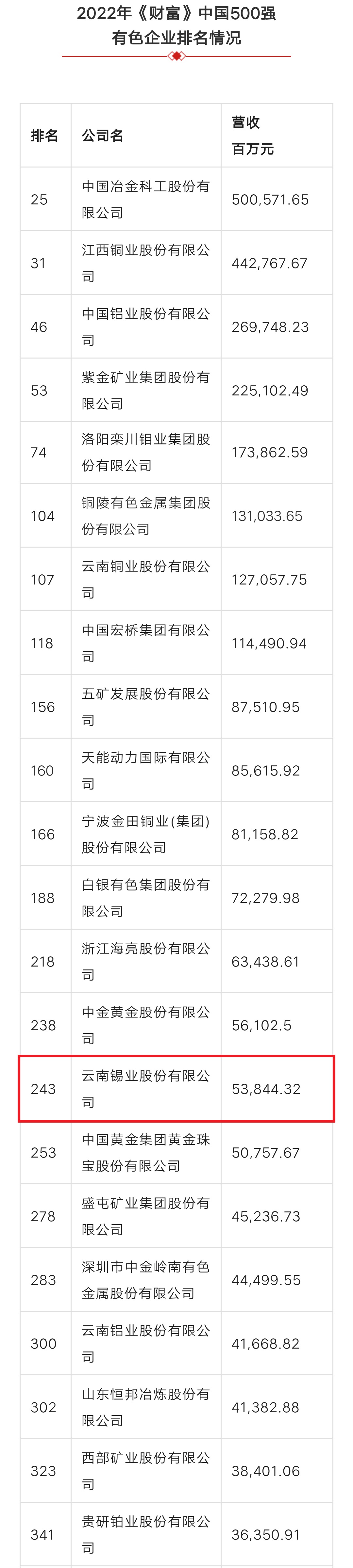 近日,2022年《財富》中國500強排行榜揭曉。今年500家上榜的中國上市公司總營業收入達到62萬億元人民幣,和上年上榜公司相比,增長約17.4%;凈利潤達到了4.7萬億元,較上年增長約9.2%。云南錫業股份有限公司以營收538.44億元的業績,排名第243位,發展實力和企業競爭力再獲認可。