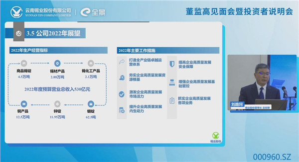 董事長、總經理劉路坷介紹了公司資源、業務產業鏈、產品及近期生產經營情況,同時充分闡述了公司未來發展戰略,即圍繞著打造全球錫、銦全產業鏈供應鏈“鏈主”的發展愿景,以“綠色智能補鏈、精深加工延鏈、改革創新強鏈”為發展理念,圍繞資源拓展、現代礦山、原材料制造、新材料和精深加工、供應鏈五個業務單元布局有色金屬全產業鏈,助推上市公司高質量發展。