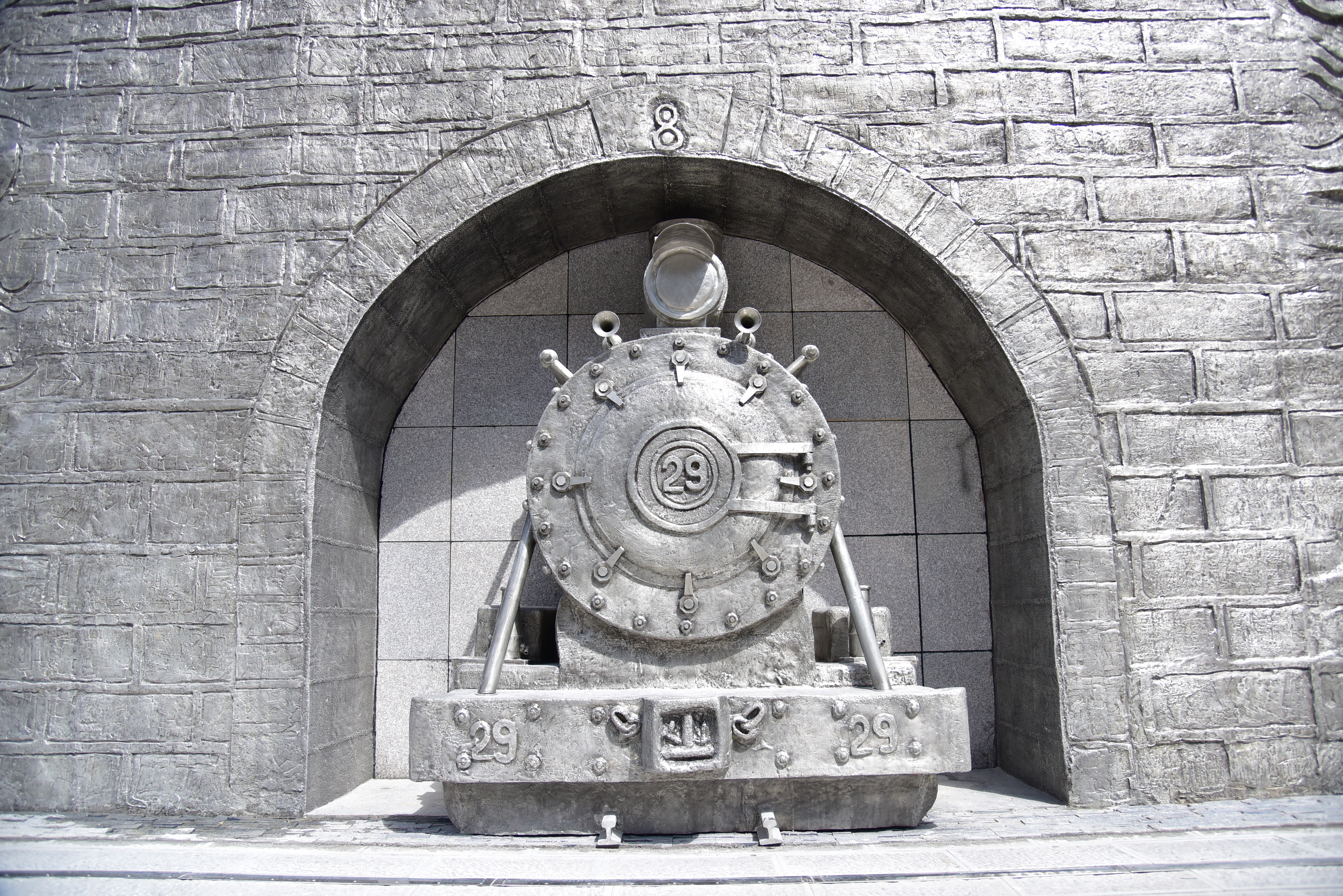 錫礦開采歷史的見證者、舊時人背馬馱的運礦方式、不同字體的“錫”字、捧著個舊金湖的雙手、代表哈尼族的吉祥鳥、古老的個舊選廠鐘樓、滇越鐵路、 “云錫三杰”、以熊秉信和丁文江為代表的地質專家,29號小火車、8號礦洞……在以英文字母“Y”為中軸的左側主題浮雕墻上,每一個元素就是一個故事,它們串連在一起仿佛在訴說著“錫映千秋”的歷史輝煌。