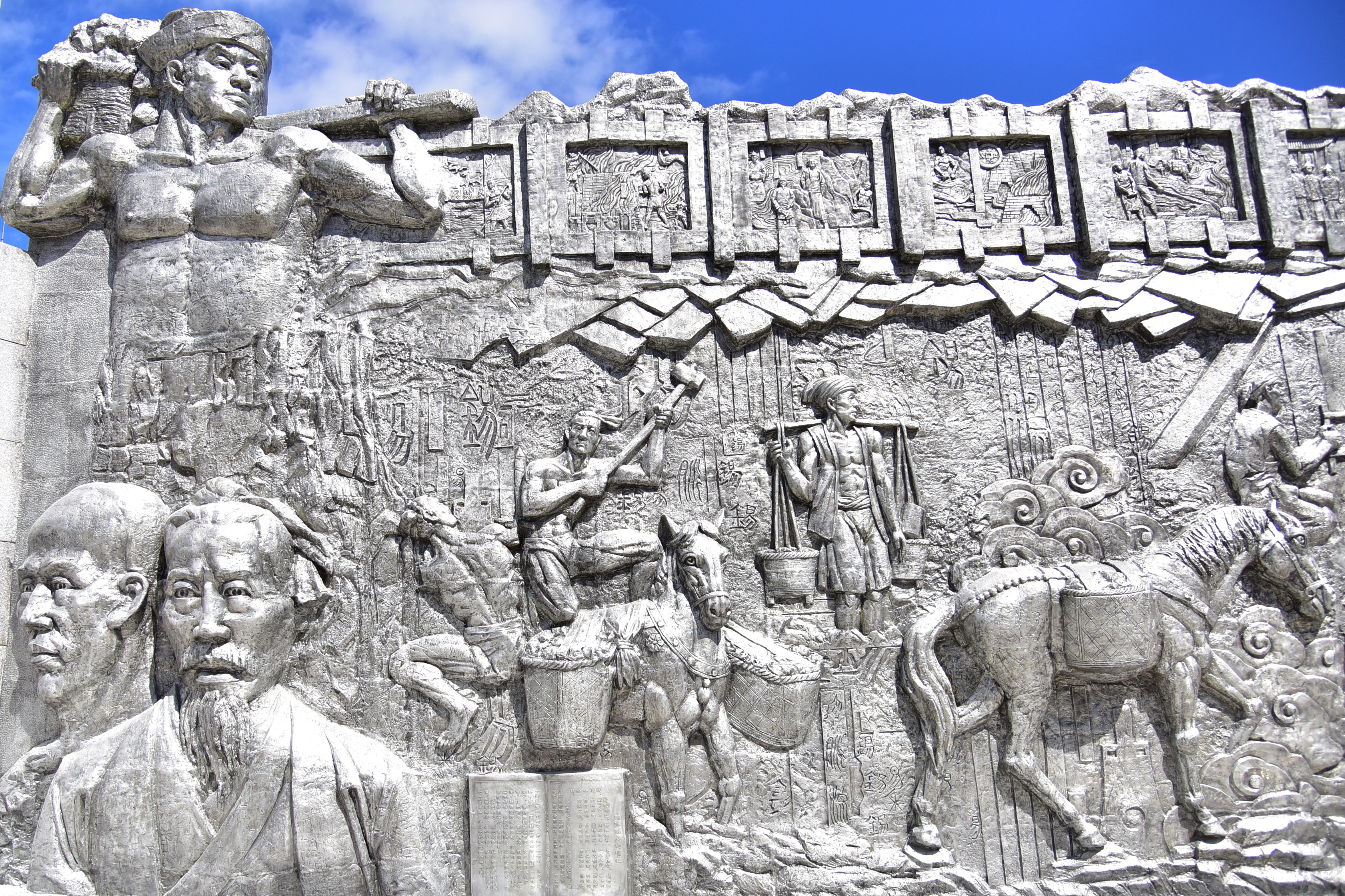 錫文化浮雕原料整體采用云錫冶煉分公司生產的“三九”精錫,由云錫騰升工藝品公司的100多名職工純手工打造,整個墻面使用精錫近40噸。墻體以云錫標志“YT”為核心,以“錫映千秋”“云騰萬里”為主題,分立于云錫個舊辦公區大門口兩頭雄偉的錫獅子一側。穿越時空隧道,沿著歷史軌跡,翊翊如生的錫業先輩和錫礦工人、科技人員,充滿動感的錫采、運、選、冶生產場景……一幅燦若星河的巨型錫業發展畫卷通過高浮雕藝術的方式展開。