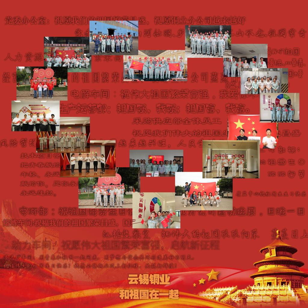 神州大地繁花似錦,華夏長空樂曲如潮。廣元職工齊力奮進,追求卓越再創輝煌。在祖國母親生日到來之際,祝偉大的祖國生機盎然、繁榮昌盛!祝百年云錫蓬勃發展,蒸蒸日上!(李 菊)