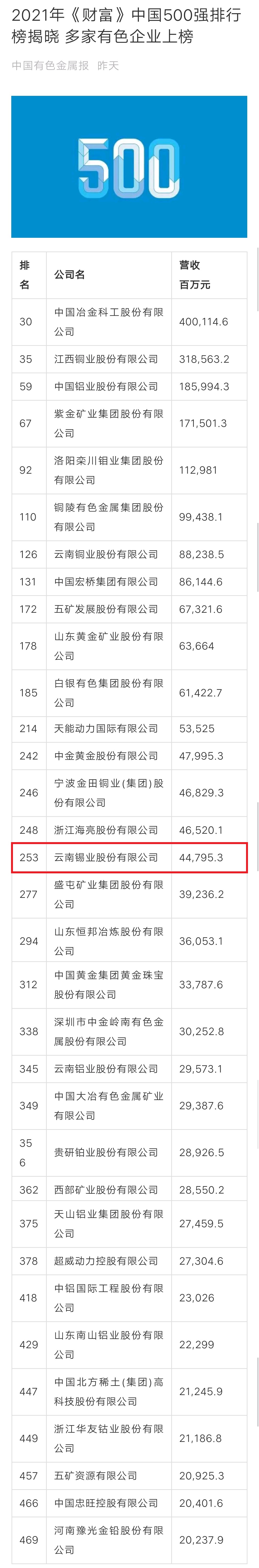 7月20日,2021年《財富》中國500強排行榜揭曉。今年500家上榜的中國上市公司總營業收入達到53萬億元人民幣,較去年增長5%;凈利潤達到了4.3萬億元,較去年增長約2%。云南錫業股份有限公司以營收447.95億元的業績,排名第253位。