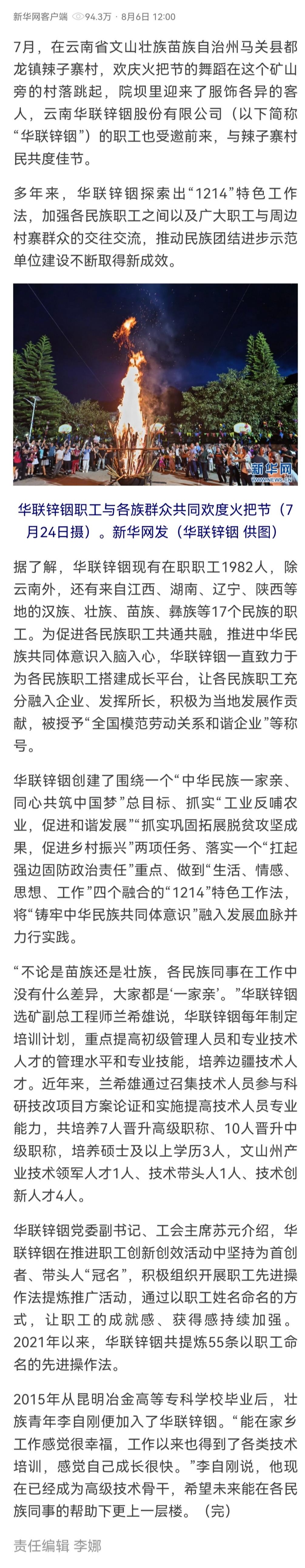 新華網:華聯鋅銦“1214”特色工作法 譜寫民族團結進步新篇