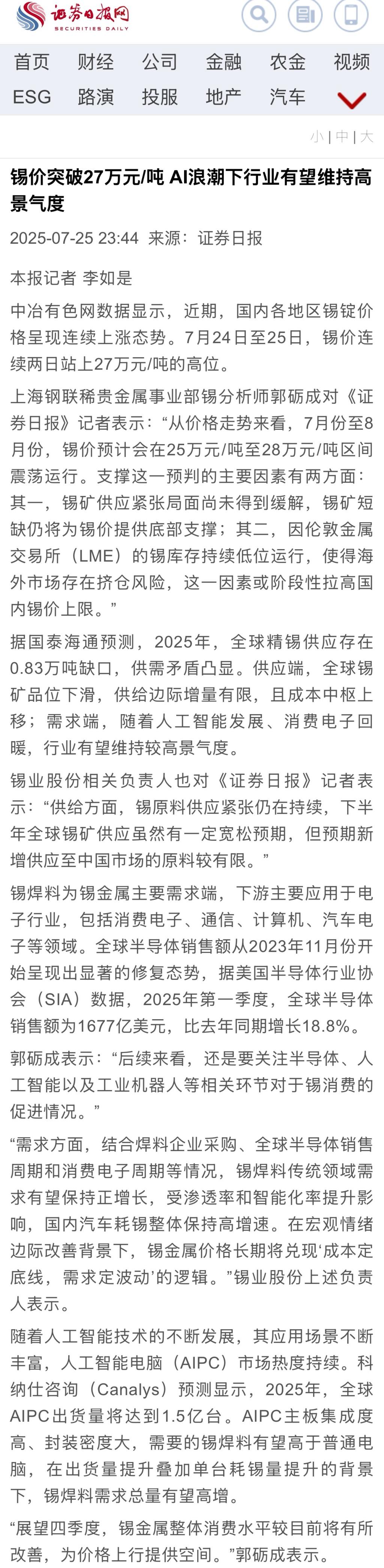 證券日報:錫價突破27萬元/噸 AI浪潮下行業有望維持高景氣度