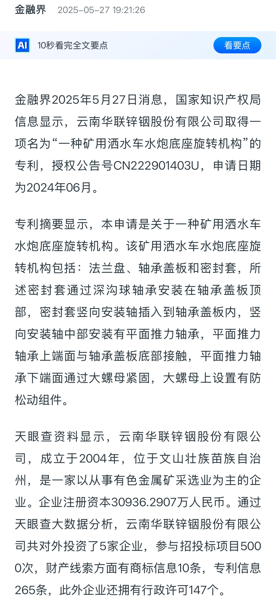 金融界:云南華聯鋅銦取得礦用灑水車水炮底座旋轉機構專利,能夠解決水炮使用壽命短的問題