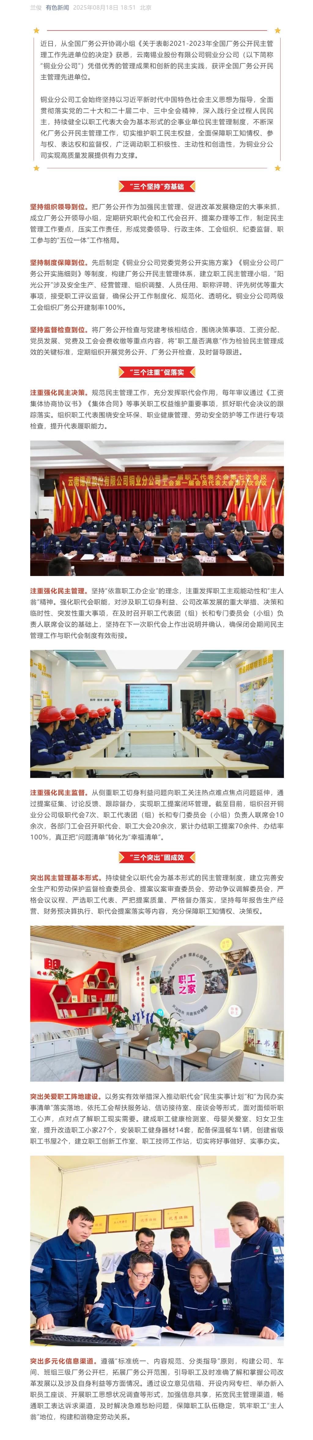 有色新聞、云南政協報:云錫銅業分公司獲評全國廠務公開民主管理先進單位