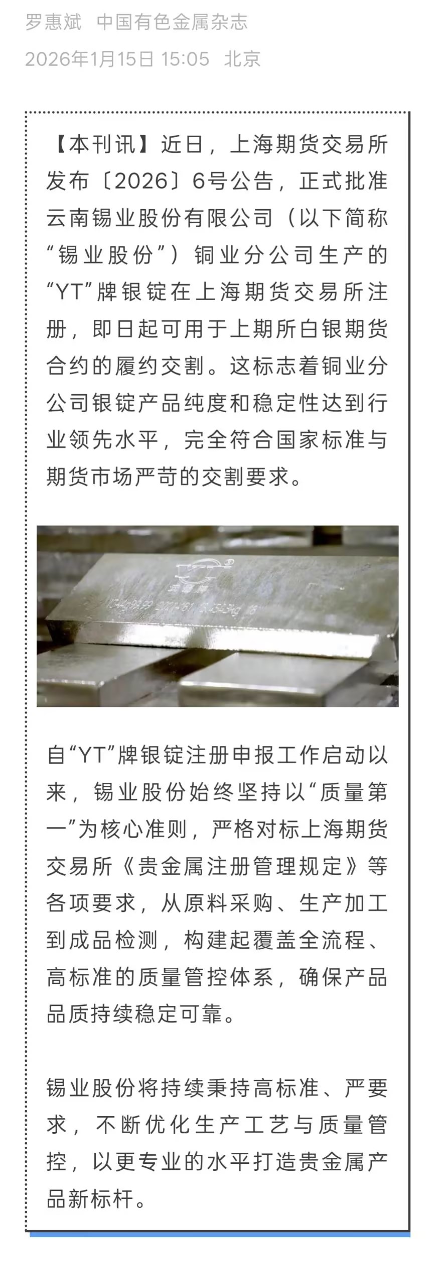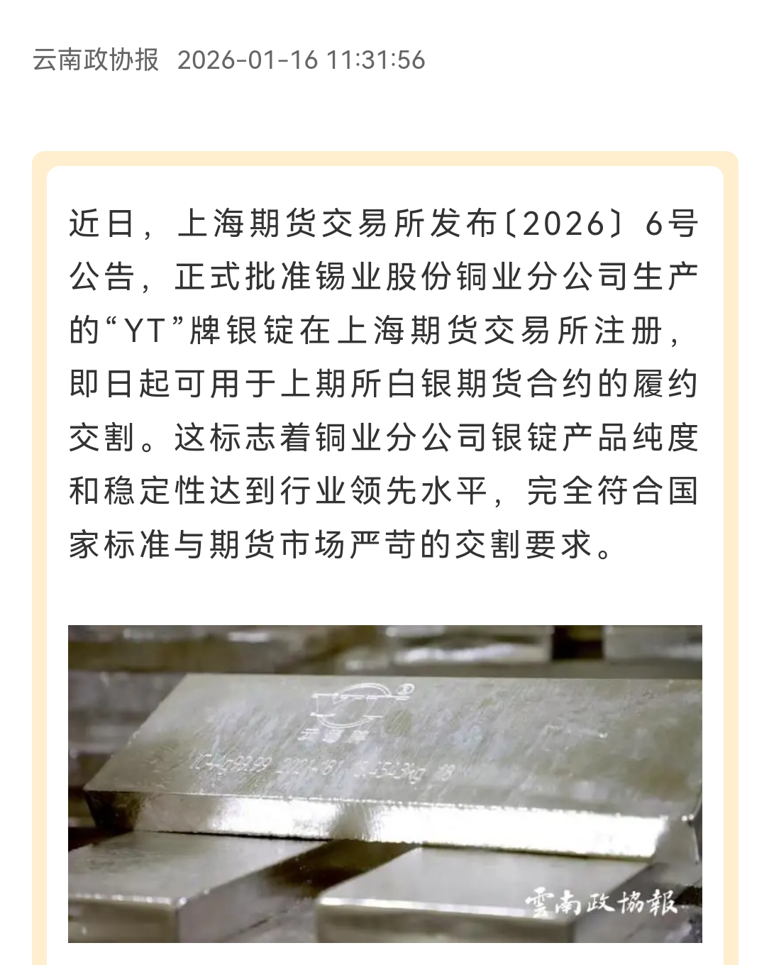 中國有色金屬雜志、云南政協報:“YT”牌銀錠在上海期貨交易所成功注冊