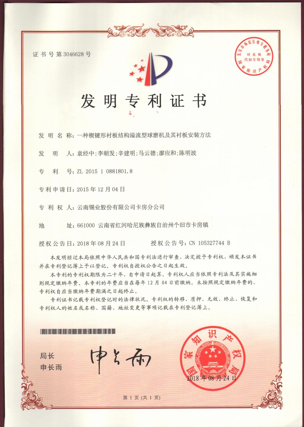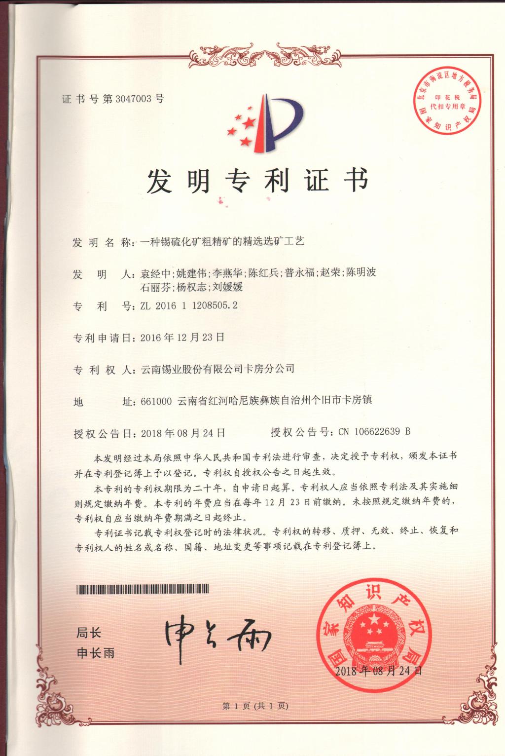 近日,卡房分公司申報的發(fā)明專利《一種楔鍵形襯板結構溢流型球磨機及其襯板安裝方法》《一種錫硫化礦粗精礦的精選選礦工藝》再獲國家知識產權局正式授權,并授予國家發(fā)明專利證書。這是今年繼8月份該分公司申報的發(fā)明專利《一種共生硫化礦中富含高砷硫精礦的降砷選礦工藝》《一種皂類捕收劑GY-10藥劑溶液的溶解配制方法》獲國家發(fā)明專利證書之后,再獲兩項發(fā)明專利授權。