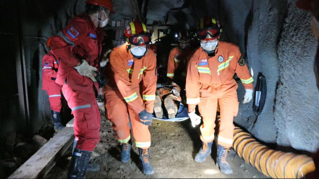 在制定科學(xué)救援方案后,救援隊(duì)員佩用正壓式氧氣呼吸器,攜帶雷達(dá)生命探測儀、熱成像儀、氣體檢測儀、對講機(jī)和個(gè)人防護(hù)裝備等進(jìn)入巷道冒頂區(qū)域進(jìn)行現(xiàn)場安全確認(rèn)和被困人員搜尋,經(jīng)雷達(dá)生命探測儀搜尋顯示3名被困人員有生命體征,但現(xiàn)場一氧化碳濃度78ppm超標(biāo),需對救援現(xiàn)場進(jìn)行機(jī)械通風(fēng),巷道冒頂嚴(yán)重,需進(jìn)行支護(hù)。在把現(xiàn)場搜尋情況及時(shí)層層匯報(bào)后,救援隊(duì)員攜帶風(fēng)機(jī)、風(fēng)帶、支護(hù)材料和破拆工具等設(shè)備分兩個(gè)組先后進(jìn)入事故現(xiàn)場,照明、通風(fēng)、巷道支護(hù)作業(yè)隨即鋪開。準(zhǔn)備工作就緒后,現(xiàn)場救援人員采用《礦山(隧道)事故救援聯(lián)絡(luò)信號》聯(lián)絡(luò)被困人員,救援隊(duì)員用細(xì)木棍將系有食品、水的導(dǎo)繩從管道送給受困人員,并安撫受困人員情緒。不料,在快速的支護(hù)推進(jìn)中,突然地壓活動(dòng)頻繁,頂板再次冒落,救援隊(duì)在同受困人員保持聯(lián)系的同時(shí),只得暫時(shí)退至安全區(qū)域待命。4名專家技術(shù)人員再次進(jìn)入事故現(xiàn)場勘察和評估,經(jīng)專家技術(shù)組確認(rèn)現(xiàn)場地壓穩(wěn)定,可以向前支護(hù),搶險(xiǎn)救援組再次進(jìn)入現(xiàn)場進(jìn)行向前支護(hù)、清理巷道。鄒文鴻等領(lǐng)導(dǎo)在現(xiàn)場指揮著救援工作,要求救援人員要時(shí)刻留意事故現(xiàn)場環(huán)境,保證自身安全才能解救他人。經(jīng)救援人員的共同努力,生命通道成功打通,被救出的3名受困人員均無大礙,已在醫(yī)務(wù)人員的護(hù)送下離開事故現(xiàn)場,去往就近醫(yī)院接受系統(tǒng)的檢查和治療。經(jīng)救援隊(duì)現(xiàn)場搜尋確認(rèn)已無受困人員,鄒文鴻下令各工作組撤離事故現(xiàn)場。