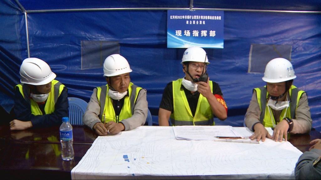 此次演練方式采取實(shí)地演練,即在實(shí)際環(huán)境下組織專項(xiàng)實(shí)兵演練,并采取單頻觀摩的方式進(jìn)行觀摩。“井下發(fā)生冒頂了,井下發(fā)生冒頂了,大家快撤,大家快撤……”井下值班長大聲叫到。演練模擬大屯錫礦1360坑450米探礦平巷掘進(jìn)迎頭外50米左右突然發(fā)生巷道頂板冒頂坍塌,并將巷道內(nèi)的風(fēng)管、水管、電話線、供電線路砸斷,巷道被垮落的支護(hù)、巖石堵塞,長度約10米左右,通過查看出入井記錄和人員定位系統(tǒng),核實(shí)單班入井人員共26人,安全出井23人,3名人員被困。大屯錫礦逐級上報(bào),州政府應(yīng)急辦接報(bào)后遂啟動(dòng)《紅河州非煤礦山生產(chǎn)安全事故應(yīng)急預(yù)案》,同時(shí)責(zé)成各相關(guān)部門、單位和救援隊(duì)趕赴事故現(xiàn)場展開救援。包括現(xiàn)場指揮、搶險(xiǎn)救援、醫(yī)療衛(wèi)生、物資保障在內(nèi)的9個(gè)工作組經(jīng)短暫集結(jié)了解險(xiǎn)情后,分別領(lǐng)命向事故地點(diǎn)進(jìn)發(fā)。與此同時(shí),現(xiàn)場指揮部指揮長、個(gè)舊市副市長鄒文鴻等領(lǐng)導(dǎo),前往現(xiàn)場指揮部指揮救援工作的開展。